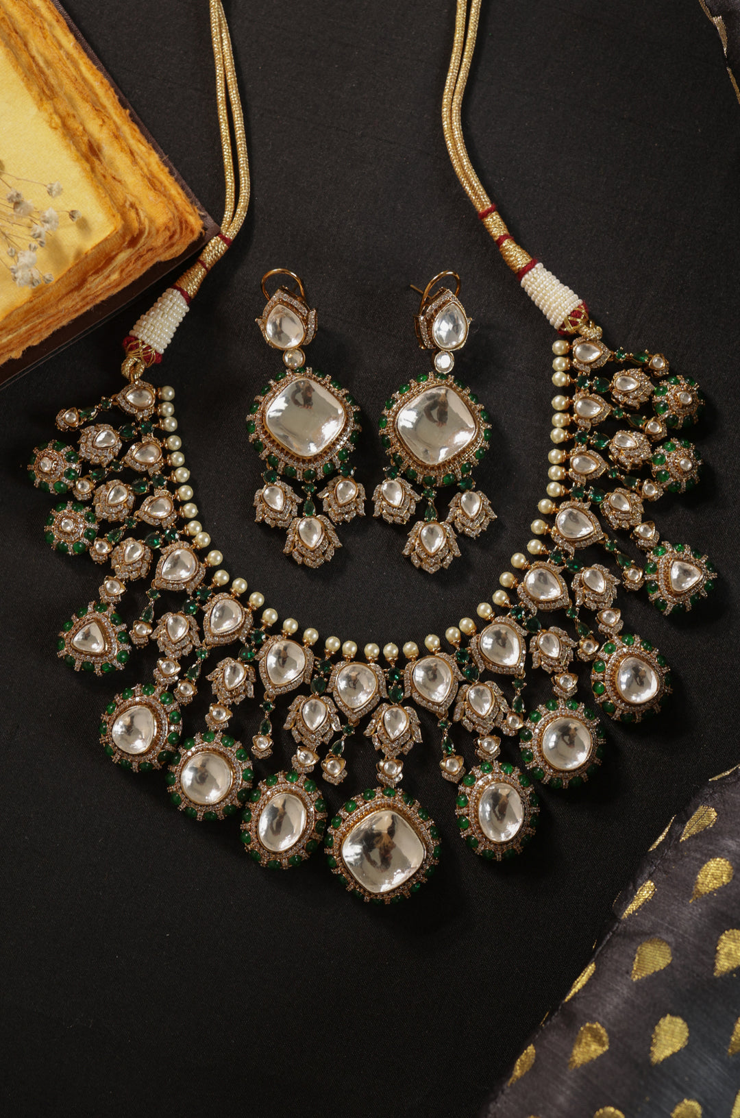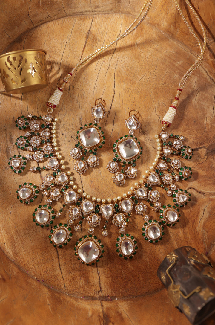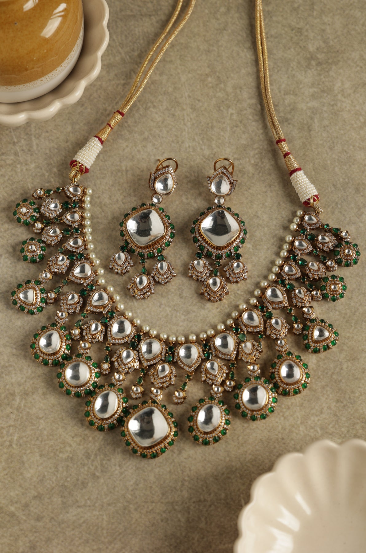 This exquisite necklace features large uncut polkis set against rich emerald green accents, making it a striking centerpiece. Its cascading design, adorned with delicate pearl clusters, offers an elegant and luxurious statement. Complemented by matching earrings, the set evokes the charm of a regal fairytale ensemble.
